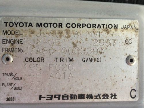 Make, model, sub model, and year The paint has faded on the roof and side panels. This is a non-smoker vehicle. My mechanic recommends replacing the struts and front two brakes. Interior and comfort features This car is a really fun drive needs very little work; replacement of the struts, and front two brakes, has some faded parts due to sun exposure but has no engine problems the interior is in good condition the wheel hub is missing a screw so it shakes a little. In all this car needs no major work just minor work for aesthetic purposes. For more pictures and/or questions please send me a message! thank you! P.S *The above VIN is incorrect, this is the correct VIN JZA80-0033397, could not enter this because its not 17 character due to that fact it was manufactured in japan* |