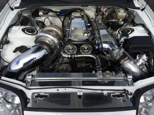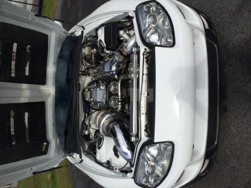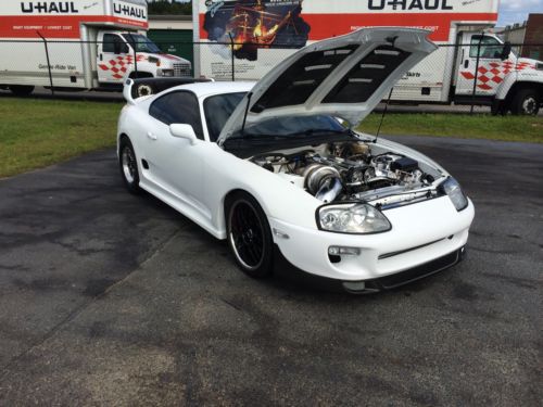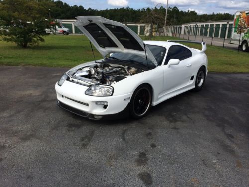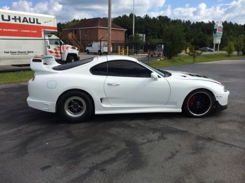 This is a 1994 Toyota Supra Turbo 6-spd. It is an Orignal TwinTurbo 6-spd white on black. I bought this car about 7-8 years ago as a project and I have only had it on the road since this past December 2013. I built the car as a weekend street car with being in traffic kept in mind during the entire process. This is a work in progress and there is a lot I still had planned to upgrade and change over time as I could but I decided to list the car once again to try to move on for personal reasons plus I rarely get to drive and enjoy the car. At times the car sits in my shop for weeks and never moves also I never drive during bad weather or in any type of rain. I just don't get time for it simply. The engine build on this car was done by a Professional shop. Simply put you will not find another supra like this one for a better price. This car is a Very Strong Platform to have and work from if your looking for a nice Supra. As of now the interior could use some Freshing up as it's the Factory black leather interior. The triple gauges on the A-pod are some generic 60mm gauges although I have a new series AEM Air/Fuel for accurate readings. The Engine is a Custom Built 2JZGTE. The engine itself total only has about 7,000miles on it. The car pulls very hard even on the pump gas setting for just cruising around although there is a switch for High boost hidden for Race gas use only. This is a very Powerful car and must not be taken lightly as with any fast car there are Dangers. The car is Currently Tuned at 1120rwhp but it will make much more than that but turned down for street purposes and around 800+ on low boost. There is a lot to list so if you have any Specific questions please message me directly I will have my contact email listed below. As of right now the car still has some factory settings left as it was fine to use as a street car. I did not build it as a pure Drag/Track car so not everything is rated High Power like the engine is. Although it was something I had planned to change In the future. As of now the car is currently using a Factory driveshaft, axles, reworked Diff, brakes but have upgraded rotors/pads and Conversion Na Brakes on the rear for the Weld Wheels, factory suspension with upgraded springs modified to fit bigger wheels Engine: Custom 3.4 Stroker 2jz Custom built Head 1mm+ over "High Temp" Custom Titan High Lift Camshafts All ARP on interior Race Bearings Custom Billet mains Precision Modified 88mm turbo silver heat polished Custom 6" Diameter Intake system "K&N" Full race 5" Diameter down pipe/Mid pipe "heat wrapped" Custom 5" Diameter exhaust with Burns Muffler Virtual Works Race Manifold "black Heat coat" virtual Works Race Intake Manifold "Polished" Virtual Works 3.5-4" anticrush Intercooler piping "polished" and boost braced Huge 6" T6 Race intercooler "polished" Tial race Wastegate and Blow off Valve Custom race oil catch can " braided lines" Unorthodox Racing pulley set "polished" Unorthodox Racing Cam Gears "polished" PwrSteering relocation Kit "chrome" Fluidyne Radiator kit Huge Dual Race electric Fans Custom Radiator Overflow Custom RKS 2400cc Fuel system Full Haltech Platinum Sport 2000 EMS Custom Complete Engine Wiring Harness with Direct Plug in for Haltech and Motec systems RPS Billet Triple Carbon Clutch kit on factory TwinTurbo Transmission Battery relocation kit to hatch with Taylor aluminum battery box Entire engine has new seals, gaskets etc. Most parts are chrome / polished Show plate, air control plate, billet coil cover