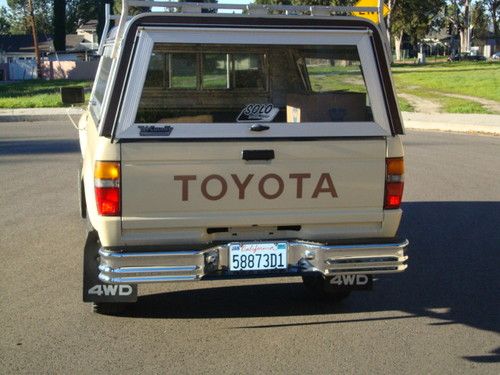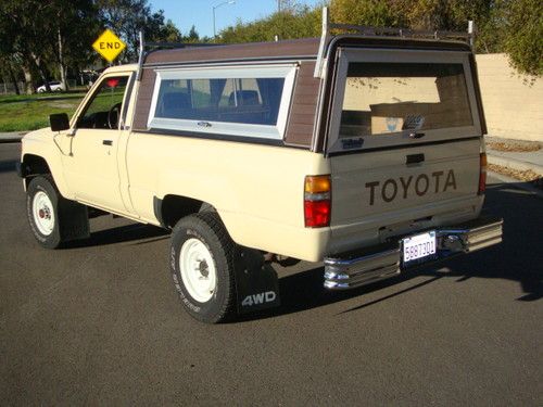 1986 Toyota 4x4 Very Original! Original Paint! Power Steering, Casette Tape, Camper Shell W/Boat Rack! Orig Rims! New Fuel Pump, Plugs,Wires I bought this truck out of Co & was pampered its whole life well taken care of! A few chips in paint! No Rust! Camper & bed liner never off truck since new! New front & rear Bumper! Very hard to replace I hate to sell it but found a 86 W/AC & 18K orig miles to replace or it would not be for sale! If you have been looking for a old man original this is it! Orig seat has a few tears & drivers side mat a few small holes in vinyl! Ask all questions before bidding! Truck Sold AS IS! Seller has right to stop auction at anytime as for sale locally! Don't wait for last minute to bid or you could loose the chance to buy! (818) 517-3907 Tks Bill Do not have all pictures on this computer will add more on Monday!