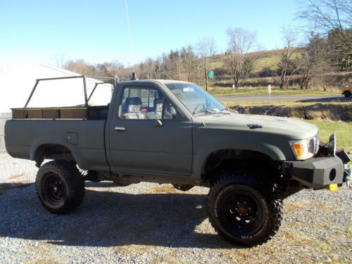 1992 Toyota pickup truck all ready equipped for bear or hound hunting or offroad the truck is in good condition frame has no rust and only spot of rust on body is a quarter size spot on surface at bottom of driver door ,also is missing pass mirror the truck has basically a new motor has new head all new bearing all new gaskets timing cover set recently rebuilt have all receipts from engine work that has been done 4 wheel drive works good has all new axles shock mounts new shocks brand new wheels and bf good wrench km2 offroad tires also has had new brakes and master cylinder installed clutch is in good condition the truck has a custom iron bull winch bumper with two piaa lights and 2 7" daylighter lights all on toggle switches WINCH NOT INCLUDED IN AUCTION the interior of the truck is in good condition for the year of truck does have cracked dash and needs gauge cluster cause no needle on speedometer has a new cd player installed all windows work good and also the outside has painted bear tracks across the hood very good on gas and nice riding truck is a hunters or houndsmen dream hunting rig the truck is sold as is and buyer is responsible for all shipping cost and shipping arrangments 1,000 deposit due at auction end feel free to ask any questions or contact at 276 759 2701 Thanks Happy Bidding