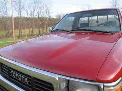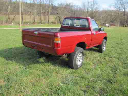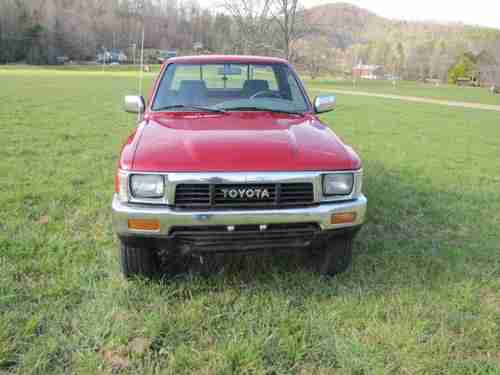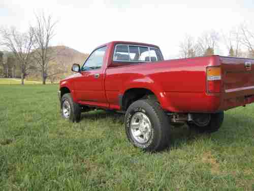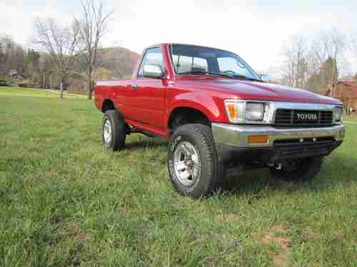 The auction is for a 12/92 Toyota Truck 4x4 with a 3.0 V6 Engine & 5 Speed 4wd Transmission that runs out great... Just had the Cylinder Head Gaskets replaced, Timing Belt, Water Pump, & Tensioners all re-done... The engine is very strong and in very good condition... The transmission & clutch are both in good condition... The truck does have a Minor Crack in the Windshield on the Driver side (see picture).... This truck has recently been painted but as you can see in the pictures there is some minor dents looks like from hail damage maybe (there is one spot on the driver side bed see picture)... The body is in great condition otherwise...It doesn't have A/C for some odd reason but I sell all kinds of Toyota Parts & will sell a kit for $250 if your interested? The interior of this truck is nice but the seat has a torn spot as always!!! This truck runs & drives great especially with the Michelin Tires 30x9.50x15 with lots of tread left on them... The wheels are in good condition with no scratches or damage...