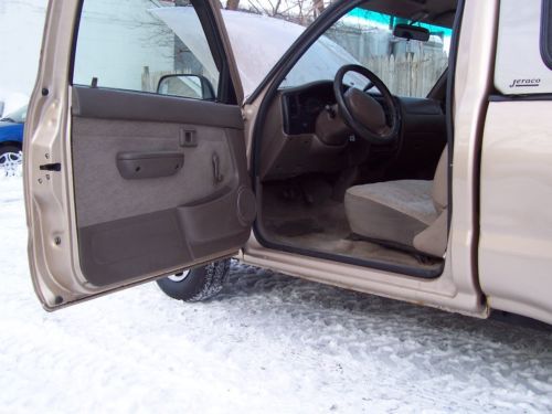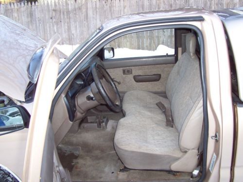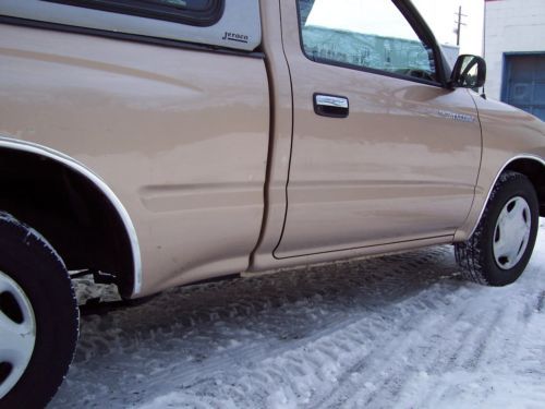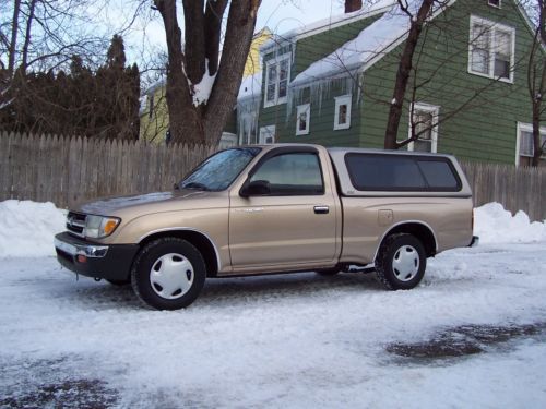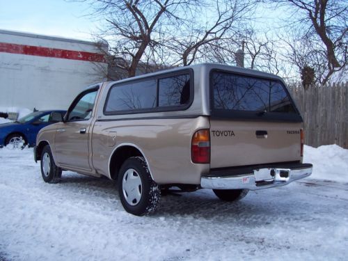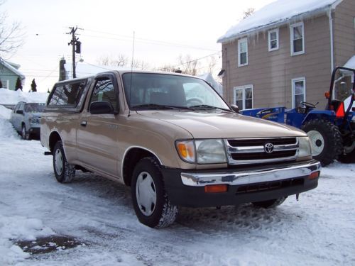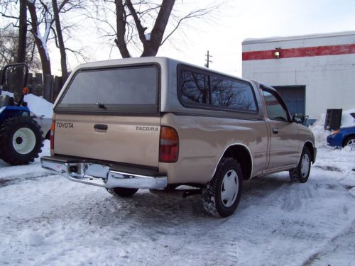 1998 Toyota Tacoma regular cab pick up, not a base plane jane model,has chrome grill ,bumpers,wheel well moldings, deluxe full wheel covers,matching fiberglass cap.bed liner,very nice solid body ,extra nice paint and chrome condition. excellent cloth interior,full carpets,nice headliner,easy to drive with smooth ,powerfull 4 cyl ,coloum shift automatic,ps,pb,factory stereo ,tape ,and factory air. this truck has never seen work truck use,very nice surviver condition. excellent running driving truck.no noise,no rattles,no leaks,shifts nice ,oil, fluids ,all clean,everything works as it should, handles ,stops ,steers,drives great... appears to be able to go across country if wanted.solid good looking,affordable import economy truck.bid to buy,not sure,ask ,still uncertain,do not bid 200 dollar paypal deposit in24 hours of end. no contact ,no deposit in 24 hours,we will offer to next to last bidder,balance in7 days,cash ,verifiable cashiers check,have clean title to transfer when funds are absolute,will do anything for your shipper,will help in any way ,will not get scammed ,don't waste your time.