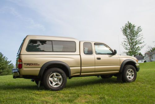 NO RESERVE. The truck is a 2003 Toyota Tacoma XtraCab, 3.4 Liter V6, Limited, SR5 Package, TRD Off-Road Package, 4x4, 5-Speed Manual Transmission, and Electronic Locking Rear Differential. Options include power windows, power locks, power steering, power mirrors, cruise control, ice cold A/C, adjustable tilt steering wheel, AM/FM CD player with cassette, sliding rear window, 4-wheel anti-lock brakes (ABS), dual airbags, alloy wheels, keyless entry with 2 key fobs, factory Toyota alarm, rear sliding window, custom fit WeatherTech floor mats, SR5 Package, TRD Off-Road Package (Toyota Racing Development), electronic locking rear differential, Bilstein shock absorbers, 4x4, spray in bed liner (Rhino Liner), K&N Intake, SnugTop Mid-High ("Sport Hi-Liner") Camper Shell (color matched exactly with factory Toyota paint), heavy-duty Curt Manufacturing receiver hitch. Only 112,000 miles! New timing belt, water pump, and accessory belts installed by Toyota dealer at 91,280 miles (Routine Maintenance). This truck has also received new front brake pads at 101,720 miles. New O2 sensor at 110,713 miles. Recent battery, muffler, and spark plugs. A brand new factory Toyota paint matched SnugTop camper shell was purchased and professionally installed for $2107.78 on 5/25/2011. SnugTop camper shell features a mid-high roof, extra large sliding glass tinted windows with window screens, flip down and sliding glass in front, and is fully carpeted and dome lighted. Truck also has a Curt Manufacturing Class III receiver hitch installed. This truck is in Very Good Condition and has been very well maintained. All owners have been non-smokers. Truck has typical small scratches and very small dings here and there. There is a spot on the carpet under the rear floor mat on the driver's side where the previous owner spilled some bleach that melted the carpet (pictured with a quarter next to it for size reference). It's not noticeable with the floor mats installed and I didn't even know it was there until I was installing the WeatherTech floor mats (previous owner didn't mention it). Cruise control works perfectly, AC blows ice cold, 3.4L V6 engine runs great, and 5-speed manual transmission shifts smoothly. Electronic locking differential works perfectly, as does the 4WD. Truck has been extremely reliable. When I was buying the truck, I ran an AutoCheck Vehicle History Report and discovered that there had been a clerical error when the previous owner was transferring the title from a Colorado title to a Missouri title. The clerk entered 33143 miles instead of 53143 miles. All of the receipts at the time of title transfer including the "Original Motor Vehicle Title Receipt" clearly state 53143 miles, but when then typed up the official title, they messed up. I went to the DMV to get this error fixed, but they can't change it once it's been entered in their system, so she made a note in the system that it was a clerical mistake. Unfortunately, it shows up as "Possible Odometer Rollback/Rollover" in the AutoCheck Vehicle History Report. I will include all supporting documents and receipts with the vehicle. Why are we selling? My wife, my 2-year old son, and I are moving out of state and we currently own 4 vehicles including a 2010 Subaru Forester and a 2008 Mercedes van. We need to sell 2 of our vehicles. Our van and Subaru Forester are better suited for our growing family. The KBB (Kelly Blue Book, kbb.com) values the truck without the SnugTop camper shell at $12,174. The camper shell was purchased for $2107.78 in May of 2011 and is in excellent condition. I've set the starting bid at $11,900 and there is NO RESERVE!!! Good Luck! If you are flying into St. Louis to pick up this truck, I can meet you at the airport and you can drive it home. I wouldn't hesitate to drive this truck across the country. It is an extremely reliable truck. Cash (in person) or Cashier's Check. Here's the cost of some of the factory options: