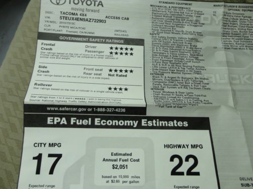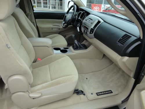 WARRANTY SINCE THIS IS TOYOTA CERTIFIED, THE NEW OWNER WILL RECEIVE 7 YEAR / 100,000 MILE POWERTRAIN WARRANTY AND IS VALID FROM THE ORIGINAL SALE DATE WHICH WAS FEBRUARY 19TH, 2010. YOU WILL ALSO RECEIVE A 12 MONTH / 12,000 MILE COMPREHENSIVE WARRANTY FROM THE DAY 'YOU' PURCHASE THE VEHICLE. WE ALREADY COMPLETED ALL RECOMMENDED SERVICE INCLUDING OUR 160 POINT TOYOTA INSPECTION AND COMPLETED A FRESH OIL CHANGE AND NEW STATE INSPECTION FOR THE NEW OWNER! CONDITION WOW, WHAT A SHARP, LOW MILEAGE & BEAUTIFULLY MAINTAINED 2010 TOYOTA TACOMA ACCESS CAB 4 CYLINDER 5-SPEED MANUAL SR5 4X4 IN PYRITE MICA PAINT AND 47,618 ORIGINAL 1-OWNER MILES. BEAUTIFULLY MAINTAINED AND INTERIOR IS EXCELLENT AND WAS A NON-SMOKER'S VEHICLE. THE PREVIOUS OWNER WAS A MATURE GENTLEMAN AND ALL SERVICE WAS COMPLETED BY A MASTER CERTIFIED TOYOTA TECHNICIAN. TIRES ARE EXCELLENT AND WELL ABOVE 70% OF TREAD LIFE REMAINING. BODY IS CLEAN AND FREE OF ANY MAJOR DINGS, SCRATCHES OR DENTS. I WOULD PERSONALLY RATE THIS TOYOTA A 9 ON A 1-10 SCALE. I COULD ONLY FAULT THIS TACOMA FOR SOME TYPICAL COSMETIC FLAWS INCLUDING STONE CHIPS ON THE FRONT BUMPER AND SMALL 1" FLAWS AND I POINTED THESE OUT IN THE VIDEO. VERY MINOR BUT I LIKE TO PROVIDE A VERY THOROUGH INSPECTION FOR ALL OF MY EBAY LISTINGS. THIS TOYOTA IS A CLEAN TITLE VEHICLE WITH A CLEAN CARFAX WHICH WE INCLUDED WITH THIS LISTING AND THE ENTIRE HISTORY REPORT CAN BE EMAILED UPON REQUEST. OVERALL THIS IS A CLEAN AND WELL MAINTAINED TOYOTA CERTIFIED TACOMA. I PERSONALLY INSPECTED THE VEHICLE AND TEST DROVE THIS TACOMA AND IT FEELS LIKE NEW. IF YOU ARE SEARCHING FOR A CLEAN, BEAUTIFULLY MAINTAINED TACOMA ACCESS CAB 5-SPEED MANUAL 4X4 WITH ALL THE TOYS IN A GREAT COLOR, THIS IS YOUR NEW TRUCK! JUST SERVICED AND READY TO GO! WE HAVE BOTH SETS OF KEYS, ORIGINAL WINDOW STICKER, ORIGINAL FLOOR MATS AND ALL OWNER'S MANUALS FOR THE NEW OWNER! BE SURE TO VIEW ALL 24 PHOTOS ALONG WITH FREE CARFAX REPORT! ONLY 47,618 ORIGINAL MILES! TAKE ADVANTAGE OF THE NO CHARGE 100,000 MILE TOYOTA WARRANTY! 1-OWNER! CERTIFIED! CARFAX SUMMARY