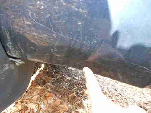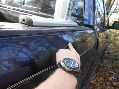 Ding on left side passenger door, dent to rear of wheel-well near rear bumper, and ding to area near upper bed rail on passenger side, with a poor paint completed. All included in images.