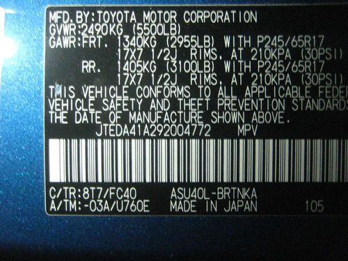 For Auction: A 2009 Toyota Highlander base model. This is a USED vehicle that is in EXCELLENT CONDITION. The base version comes with 17-inch alloy wheels, privacy glass, a tilt-and-telescoping steering wheel, air conditioning, a CD stereo with an auxiliary input jack, and full power accessories. The 2.7L 187-horsepower 4-cylinder engine, paired with a 6-speed automatic transmission, delivers 20 mpg city and 27 mpg highway. If you add a trailer hitch, this particular model can pull 3,500 lbs. The Highlander is one of the most refined vehicles in its class. Visibility is excellent all around, and the steering is light enough to make the Highlander easy to maneuver in tight spaces yet adequately precise while cornering. In particular, Toyota employs measures to minimize road noise, and uses a sophisticated engine mounting system to isolate noise and vibration. Vehicle safety control and anti-lock brakes with electronic brakeforce distribution and brake assist are standard on the Highlander. An electric power steering system, standard on all models, also serves several safety functions. The non-hybrid Highlanders have straight-line steering, which means the power steering system helps offset a pull to the side due to different surfaces in hard braking. All Highlanders also have a corner braking feature in which power steering assist guides the driver toward restoring vehicle stability.The Highlander's standard feature list includes keyless entry, air conditioning, cruise control and power accessories. Safety & Security: 4-wheel ABS, front, rear and third row head airbags, dual front side-mounted airbags, child seat anchors, emergency braking assist, ventilated front disc / solid rear disc brakes, rear door child safety locks, auto delay off headlamps, 2 front headrests, 3 rear headrests, passenger airbag occupant sensing deactivation, rear center 3-point belt, front seatbelt pretensioners, stability control, traction control, electronic brakeforce distribution, front height adjustable headrests, rear height, passenger head restraint whiplash protection system, driver head restraint whiplash protection system, tire pressure monitoring. Additional: Bid high! Win the auction and pay the deposit! After you have seen and driven the vehicle, if you are not happy with the purchase and wish to discontinue the transaction, your deposit will be refunded either directly or through PayPal. Upon completion of the transaction, however, there will be no refunds. I want you to be happy with the vehicle. Please contact me if you have any other questions. Emissions inspection sticker is valid through June 2014. Thank you. |