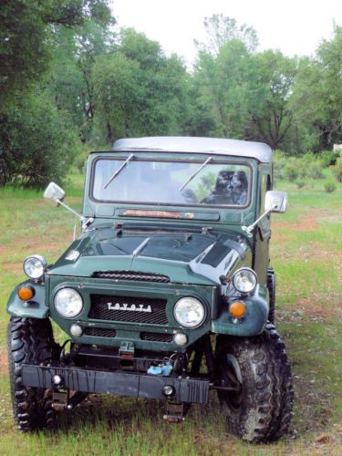 1964 Toyota FJ40 Landcruiser. Engine is early model Chevrolet 350 V-8 with Edelbrock off-road carburetor. Has a Turbo 350 automatic transmission mated to a landcruiser 4-wheel drive gear box. Disc brakes on all 4 wheels. Power steering conversion. Dual fuel tanks. 15 x 10 Mickey Thompson aluminum alloy wheels with 33 x 12.50 Super Swamper tires with good tread (spare is a brand new 33 x 12.50 uniroyal mud terrain tire). Comes with original hard doors, sides and upper tailgate portion for the top (flat black in color), the original roof was unrepairable and gone. The cruiser has surface rust in a few spots and rust damage where Fj40s are prone to on the rear portion of the tub. And a box full of assorted FJ40 new and used parts along with a couple Haynes auto repair manuals. Vehicle is in running condition but could use some carb adjustment and a tune up. Speedometer / odometer is not working, but will throw in a garmin vehicle GPS that I use for telling approximate speed. Has a CD /FM/AM with ipod jack stereo and wiring for speakers is still in place but speakers were worn out from summertime heat and currently has no speakers. I've had the vehicle since 1992 and was my daily driver up until 2002. Since 2002 it has been mostly trailered to my off-road destinations.