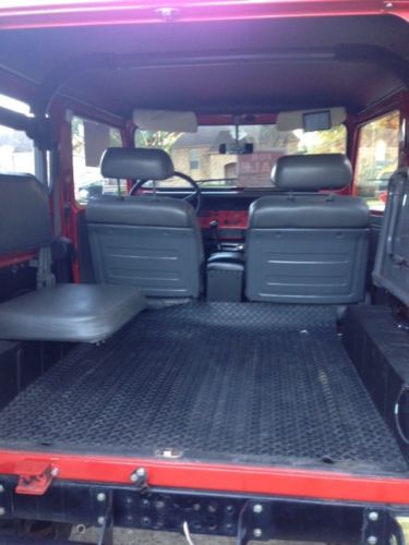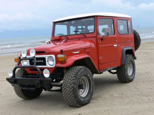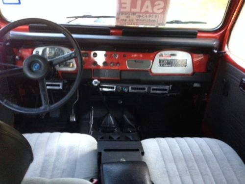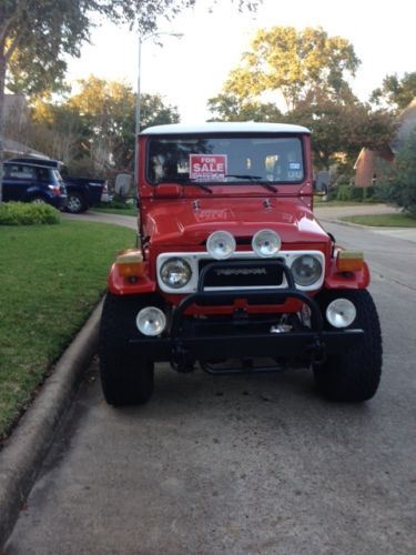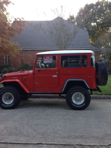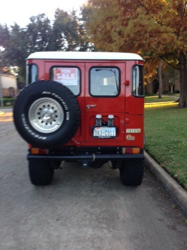 1979 Freeborn Red FJ40 Landcruiser with white top. Restored by The Cruiser Company, Little Rock, Arkansas in 2000. I purchased it in 2005. It has been kept in the garage. Two inch lift. AM/FM radio and Tuffy console added. AC added. Power steering out of Saginaw Power Steering Co. Otherwise mostly Toyota parts used. Fog lights added, but not connected. Straight 6, 4WD, 2F motor. Carburator rebuilt by master Toyota tech in 2011. Clutch slave and clutch master cylinders replaced by a Toyota dealership in 2013. Rear wheel cylinders replaced in 2012 by Toyota master tech. Front disc brake pads also replaced by Toyota master tech in 2011. Brush guard added by Cruiser Co. in 2000. Reese trailer hitch and electric hook-ups added to bumper built by Cruiser Co. 4 BJ Goodrich tires and mag wheels. Tires have lots of life left. Basically, the vehicle is in great condition and has very few small scratches and no dents. 94463 mileage. $1000 deposit required and you pick up in Katy, Texas (Houston). Look at restorations on the website cruiserco.com for many pictures of this vehicle being restored (John Windsor's 1979 FJ40).