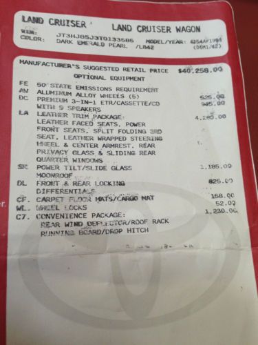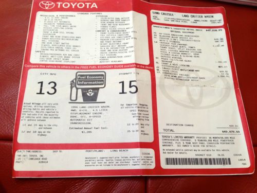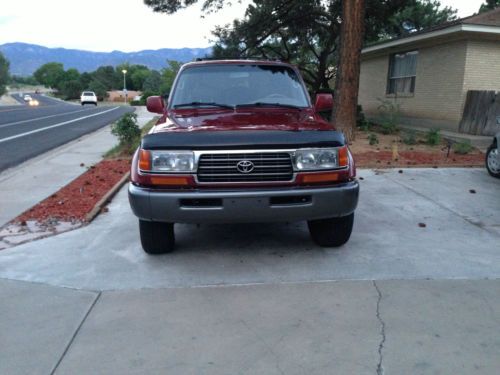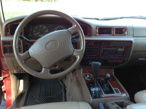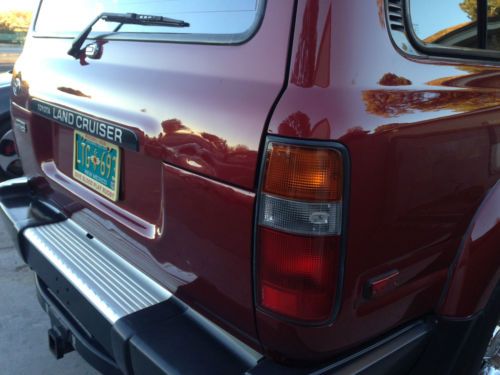 Auction for this exceptional, low original mileage for its year 3-owner, clean Car-fax history, well maintained, 1996 Toyota Land Cruiser full-time 4WD wagon! Oh-so-smooth, in fact, she drives beautifully and yields an excellent highway ride. This Land Cruiser has been inspected, serviced and has been totally gone through, no issues, ready to go. Well serviced throughout her life as you can see in the Car-fax . I must say this SUV's shifts are smooth from the 4-speed automatic transmission, never hard shifting and the, 4.5L engine is powerful, has a strong feel and is reliable! A thoroughly capable SUV that is solid and sturdy. The "Medium Red Pearl" exterior shines. Looks really great for her year! The "Beige" leather interior is in amazingly good condition for a 96' vehicle, just look at it!! Seating is comfortable and supportive front and rear. Rear seating area can be turned into a large convenient cargo area by folding and flipping the seats! Abundant storage possibilities! Air conditioning is ice cold too. She features, leather trim package, 3rd row seating, power sunroof that works great, rear door child locks, Toyota receiver hitch, power driver and passenger front seats, driver seat power lumbar, 4-speed ECT transmission, good condition tires, 16" alloy Chromed wheels, 4.5L, 6-cylinder engine, third row seats conviently fold up the sides, folding and flip-forward second row, No Rust!!! “ Arizona New Mexico vehicle” All books and records are with the vehicle including window sticker from new…. Most recent services done: Main Carrier Seal replaced-new rear shocks-new front rotors-new master cylnder-ac serviced/powersteering flushed-new valve cover gasket-new winshield and gasket-transmission hoses and service.This truck is ready to go another 100k + The bad/ugly *small dents on the tailgate (the only body damage) *supermarket dings on both sides *some rock chips on the front end *rear cargo carpet has a stains *small cut on drivers door interior panel