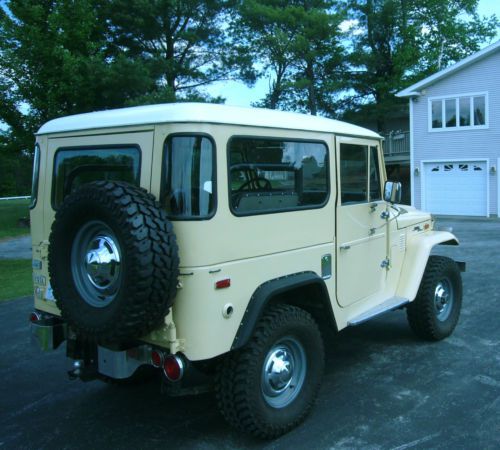 1973 FJ40, Nicely restored Toyota Land Cruiser FJ40. with the extra horsepower of a Chevy Edelbrock 350 V8 engine, the extra range of a Toyota 4 speed transmission, new disc brakes all around, reconditioned interior, new paint and new on/off road tires. Odometer reading 69600. This is a real beauty, with extra pains and expense to make many exterior in bright chrome and stainless finishes. Completely functional, excellent restoration, ready to run on the road and off road. It's hard to find a nicer ready to go original FJ40.