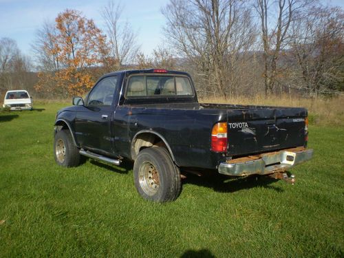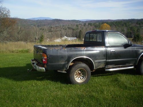 1998 Toyota Tacoma, 4 cyl, 4wd, cab is pretty solid, rear box is useable with some work, truck is rough, lots of minor dents, interior needs major cleaning and driver's seat has some rips, 4wd works ok, engine has miss, no battery, needs exhaust, frame is rusty to the point it is unsafe to drive.