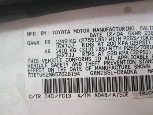 For sale is a 2005 Toyota Tacoma. It is white with gray interior. There are 275,364 miles on it. The exterior does have some damage as you can see in the pictures. The interior also has some rips and stains. ***this truck does NOT run. I am not sure what the problem is. It cranks but will NOT start. You can NOT drive this truck. If you have any further questions or concerns please contact me prior to bidding. |