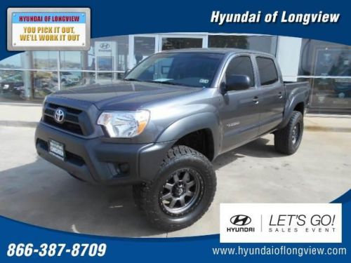 2013 Toyota Tacoma 2WD Double Cab V6 AT PreRunner POWER WINDOWS AIR CONDITIONINGHyundai of Longview presents this CARFAX 1 Owner 2013 Toyota TACOMA 2WD Double Cab V6 AT PreRunner with just 16508 miles. Represented in GRAY and complimented nicely by its GRAY interior. Under the hood you will find the V6 4.0 Liter coupled with the 5-SPEED ELECTRONICALLY CONTROLLED AUTOMATIC TRANSMISSION W/(ECT-I). Recently reduced to $27777. Options and Safety Features: Nicely equipped with 3-point seat belts w/emergency locking retractor at all seating positions -inc: front seat belt pretensioners, force limiters & adjustable shoulder anchors, automatic/emergency locking retractor for front passenger & rear seat belts, 4-wheel anti-lock brakes, Brake assist, Daytime running lights, Driver & front passenger advanced airbags w/passenger airbag cut-off switch, Driver & front passenger seat-mounted side airbags, Electronic brake-force distribution, Front & rear side curtain airbags, LATCH lower & top tether anchors for front passenger seat & all rear seats, Rear door child safety locks, Smart stop technology, Tire pressure monitor system, Traction control, Vehicle stability control and (4) FIXED CARGO BED TIE-DOWN POINTS, (5) CUP HOLDERS & BOTTLE HOLDERS, 1-PIECE FRAME RAILS W/(8) CROSS MEMBERS & FULLY BOXED FRONT SUB-FRAME, 16 STYLED STEEL WHEELS, 2-SPEED WINDSHIELD WIPERS, 4-WHEEL ANTI-LOCK BRAKES, 4.0L DOHC EFI 24-VALVE V6 VVT-I ENGINE, 4WDEMAND PART-TIME 4-WHEEL DRIVE, 60/40 SPLIT REAR BENCH SEAT W/ADJUSTABLE HEADRESTS UNDERSEAT STORAGE, ABS (4-WHEEL), AIR CONDITIONING, ALUMINUM/ALLOY WHEELS, AM/FM STEREO, AUTOMATIC LIMITED SLIP DIFFERENTIAL, BLACK BUMPERS MIRRORS DOOR HANDLES & OVERFENDERS, BLACK GRILLE INSERT & ARGENT SURROUND, BLUETOOTH WIRELESS, BRAKE ASSIST, CENTER CONSOLE -INC: COVERED ARMREST STORAGE COMPARTMENT, COIL-SPRING DOUBLE-WISHBONE FRONT SUSPENSION, DAYTIME RUNNING LIGHTS, DECK RAIL SYSTEM W/(4) ADJUSTABLE TIE-DOWN CLEATS, DRIVER & FRONT PASSENGER ADVANCED "You pick it out and We'll work it out!"