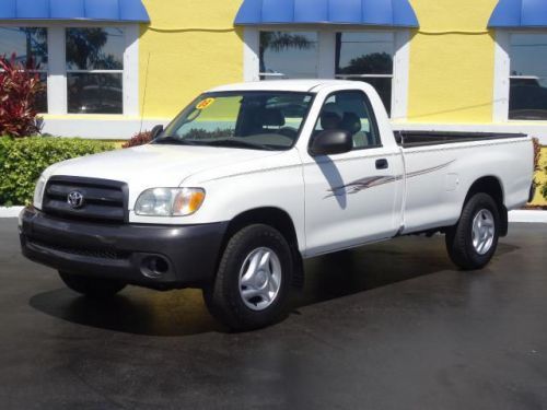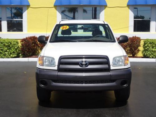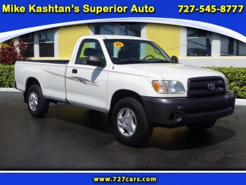 2003 TOYOTA TUNDRA, ONLY 47K MILES, MANUAL TRANSMISSION, COLD A/C, BEDLINER, CD PLAYER, TILT WHEEL, TOWING PACKAGE AND SO MUCH MORE! Why buy from us? Mike Kashtans Superior Auto Sales is a family owned and operating Automotive Dealership located in Pinellas Park, Florida. We are celebrating our 30th year and have proudly served the Tampa Bay, St. Petersburg and surrounding areas since 1983! We BUY & SELL clean, quality used cars, trucks, vans and SUVs! All of our Vehicles come with a Free Carfax Report and a 30 Day or 2000 Mile 100% Parts and Labor Limited Powertrain Warranty! We sell more then just cars, we offer the added value and quality that makes our dealership different from the rest! Our team is professional, and we offer a relaxed, stress free, no hassle environment! We would also like to encourage you to use the expertise and resources we have to offer as we have access to over 25 financing sources serving customers with excellent to credit challenged ratings! Our Credit Unions are currently offering rates as low as 2.99% APR! Looking to sell/ trade your car? Sell your car for cash today... Mike Kashtans Superior Auto Sales is also the Tampa Bays leading used car dealership when it comes to buying your car. We're always looking for quality pre-owned cars to sell, and it doesn't matter how old or new it is. Bring your vehicle by our Pinellas Park, FL location and let us have a look at it, ALL Makes and Models are accepted, we will make you an offer and pay you CASH on the spot! Trade-Ins are always welcome and often offered to the public at wholesale prices! Stop by our dealership today or give us a call @ 877-740-0266. You can view our inventory @ www.727cars.com Looking to sell your car? Sell your car for cash today... Mike Kashtan's Superior Auto Sales is also the Tampa Bay's leading used car dealership when it comes to buying your car. We're always looking for quality pre-owned cars to sell, and it doesn't matter how old or new it is. Bring your vehicle by our Pinellas Park, FL location and let us have a look at it, ALL Makes and Models are accepted!