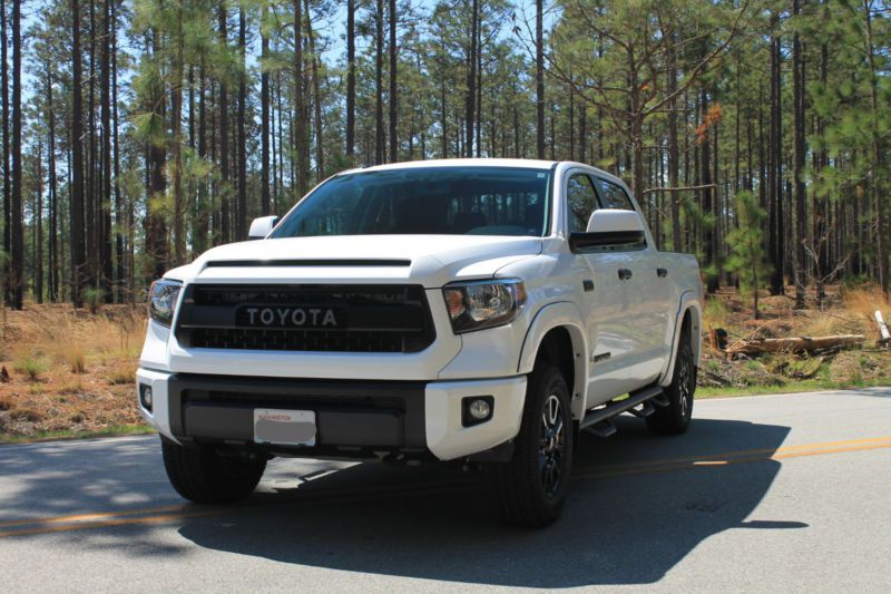 2015 Toyota Tundra CrewMAX TRD Pro. FACTORY installed add-ons on this truck are the Tow Package, Predator Step Bar, Color-keyed fender flares, spray-in bed liner, remote engine start, clear paint protection hood and door packages, deck rail with adjustable tie-down cleats and TOYOTA DEALER installed UV shielding window tinting and exterior paint sealant. Excellent shape inside and out. No accidents. What makes this trim special is the TRD Dual exhaust, the skid plate, black TRD rims, the unique Toyota front grille, special seats, and specially designed TRD Bilstein shocks w/ remote reservoirs.