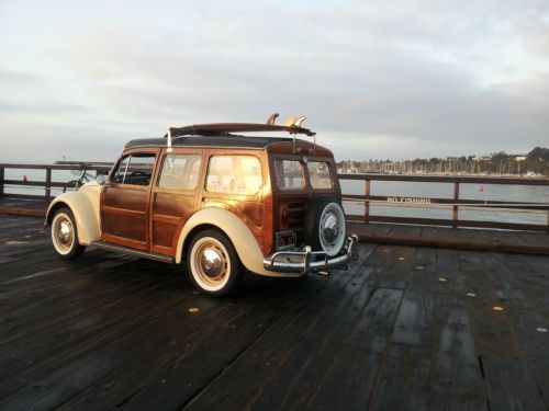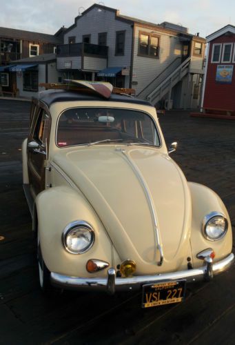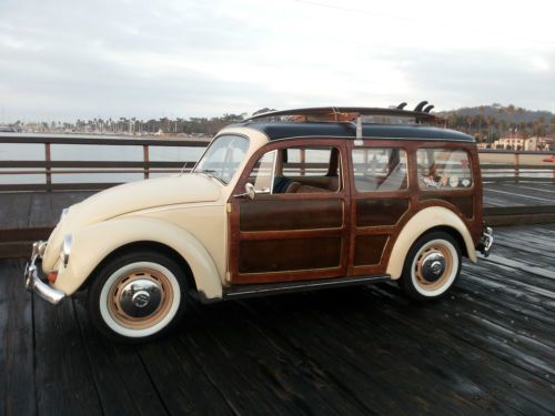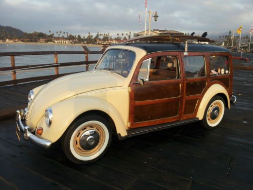 1967 VW Beetle Woody custom built around late 60's-70's have the original 2 part build plans. Paint is newer and shows very nice but not show quality. Very few chips no dents. Current paint looks to be 50's Porsche Ivory? Interior looks new no rips or fade. Original AM Radio with its speaker works like a charm. Heater and its controls were deleted, can be replaced have some of the parts.Door handles were also deleted with plans to install remote door locks. Turn signals were moved over horn openings. Car was rebuilt 18K miles ago (according to previous owner), it drives very strong starts every time and cruses at 70 plus like a jetliner. Second gear or clutch cable needs adjustment. Front axle beam needs to be replaced do to wear on upper right shock tower. Have low mile German axle beam with bearings. The wheels are original as the wheel covers.Tires and porta - white walls are new. The wood shows great with lots of patina. Rear shocks are air shocks 25-200psi capable.Front shocks are original spec.Have two sets of keys original jack, and tools with tool roll. 1967 California plates are registered and up to date. Shipping and pick up is buyers responsibility, but I'll be glad to assist. PS; New surf board included! |