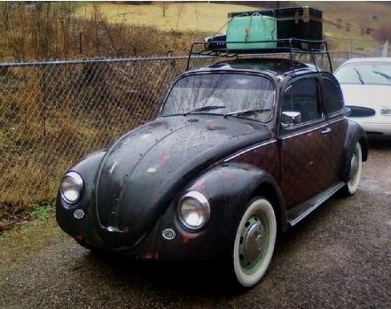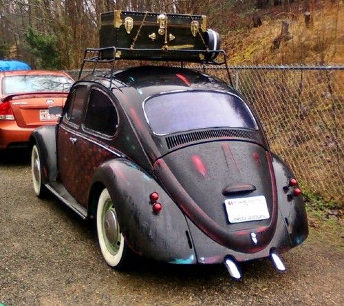 This is a 1968 Volkswagen Beetle. It has a heavy patina paint job with black and red lacing on the sides. It has a few dings and a few small rust holes. It has pop out rear windows. The brake lights have been replaced bullet style brake and tail lights. The roof rack does not go with it. I don't want you to think this is a perfect car because it isn't. It runs , shifts and stops great. It's a ton of fun and grabs a lot of attention. It needs the driver's rear wheel bearing replaced soon but I drive it daily. The head liner is ok with one tear from something hitting it. The seats are grey. The front seats have tear in the bottom where you sit. The rear seat is ok. The door panels are black. The pans should be replaced due to rust spots. The radio is out but the one that came with the car will go with the car. The gauges work. The vinyl has been removed from the dash. It has a new electric fuel pump installed and new front shocks.