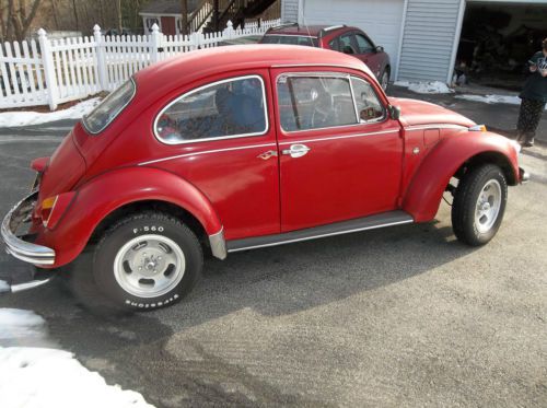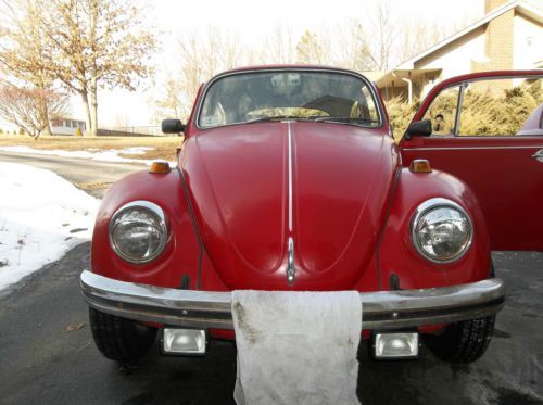 Up for sale is a Vintage Red 1969 Volkswagen Beetle. Runs and drives very good. Brakes stops well. Brakes fairly new. Transmission shifts good. Currently has inspection. Everything works even the heat. It needs headliner, included. Lots of new parts on Beetle. New generator. New push rod tubes. Lots of engine gaskets installed. It does drip oil. Needs new rear main seal, included. Battery a few years old. Has Tachometer, voltmeter and oil temp gauge. Has fog lights. The floors are there. Passenger front floor is not original. New coil over shocks. New empi single quiet exhaust. Manual included. Has new seat covers. Nice stereo cassette with 4 loud speakers. Tires brand new last year. Seatbelts front and rear work good. This car is road ready. Not show car. Paint faded on roof. Some rust and patchwork here and threre. Very fun car. Headturner. Buyer responsible for pickup. Sold as is. I have the title.