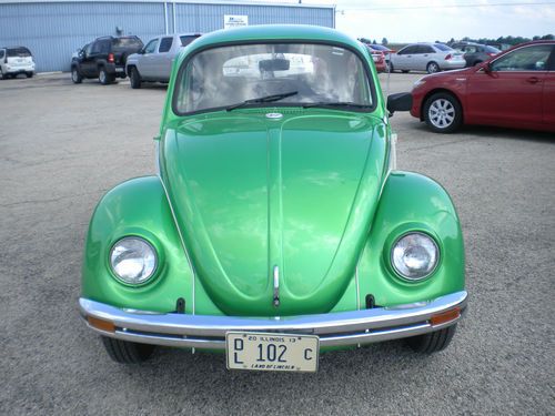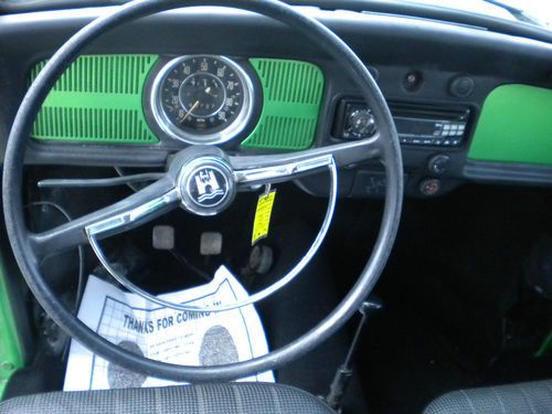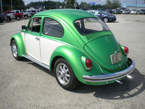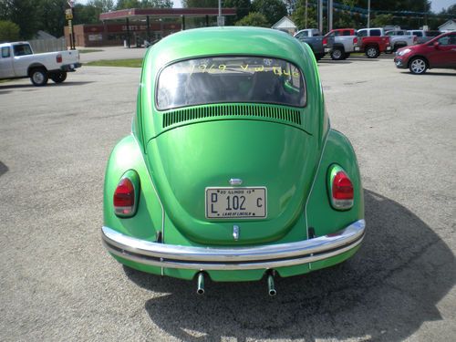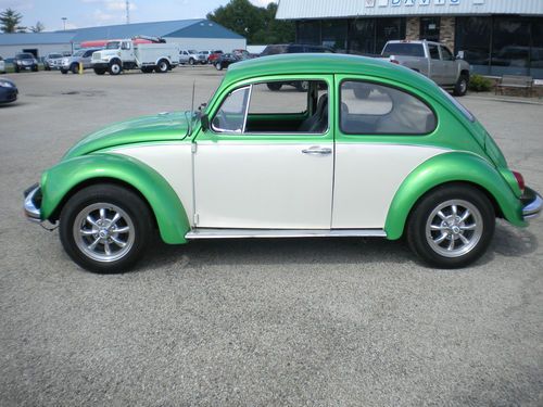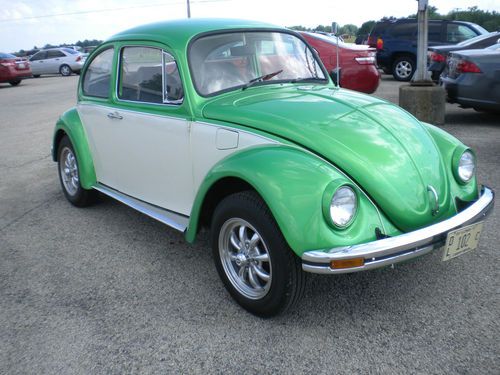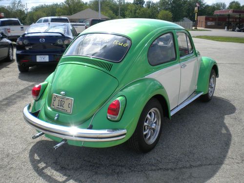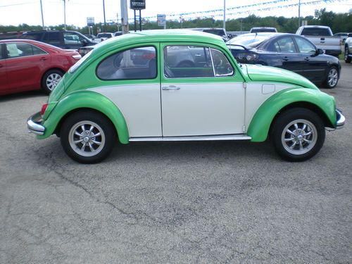 This auction is for a 69 volkswagon beetle. The car was a local car that was traded into our dealership. When traded in the car had faded red paint. Our bodyshop was slow so they decided to have fun with it and paint it two tone. The green is synergy green that is used on the new camaros. The paint and body work was compeleted at our gm dealership and looks great. We also installed new wheels and tires to enhance the image. We installed new tail lights, marker lights and turn signal switch. We had our repair shop rebuild the carburators and the car runs great. This is a great little car for its age. The interior is in decent condition but could use new carpet. This vehicle is sold as is due to its age. If you have any questions pleas call Davis Buick GMC at 309-647-1212 and ask for Cole in parts.