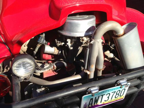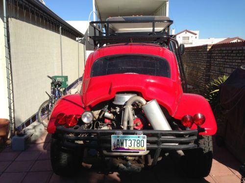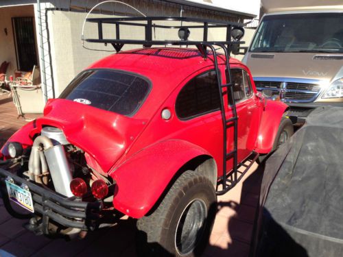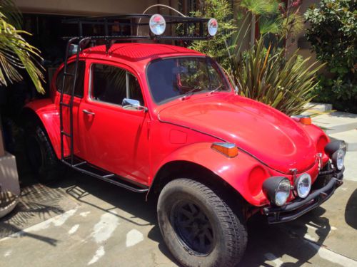 Great Baja Beetle with recent paint, newer OEM STYLE interior. Edelbrock 4bbl carb, quiet exhaust, new shifter, P.O. stated "Freeway Flier" gears in transmission for lower RPM. 4 Hella off-road lights (with covers) wired on two separate switches. Roof rack, ladder, bumpers and running boards all expertly fabricated, black powder coat in excellent condition. Tow Bar for 2" ball and 4-flat light wiring. New RH Side CV joints, LH side axle replaced recently by P.O. Operating with Aux fuel tank in parcel shelf area. Factory tank and A/B switch & solenoid present but disconnected. On board air compressor and tank, serious air horn. (HOSE SHOWN IN PHOTO NOT INCLUDED, it was dry-rotted) Remote oil filter and other engine upgrades done by P.O. but specifics not known. Runs and drives well, no smoke... Black steel spoked wheels, near new 175/75R15's on front, 31"s on rear.