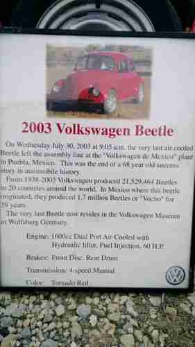 I have for sale a 2003 Mexican Beetle that has all the conversions done to make it a U.S. legal titled 1974 Volkswagen Beetle. When you go to tag her she is a 1974 Beetle. This Beetle has been garage kept all of her life, she has only been touched by rain 5 times. I have taken excellent care of her since I have owned her, I even have records of every drop of fuel I have put in her. She has won many car shows and even took 1st place in Darryl Starbirds 50th Anniversary car show. This Bug WILL turn heads. She has 44,000 kilometers which comes to close to 20K miles on her. I recently purchased a Harley and it is time to sell my Bug. She has a set of Empi black powder coated wheels with great tires, 20% professionally tinted windows, Empi short throw shifter, LED tail lights and the battery and fuel injection compartment have been weather/corrosion treated with rubberized coatings.