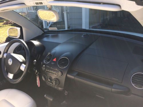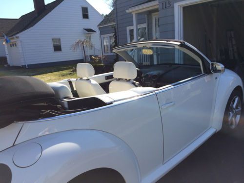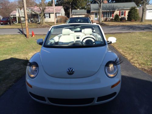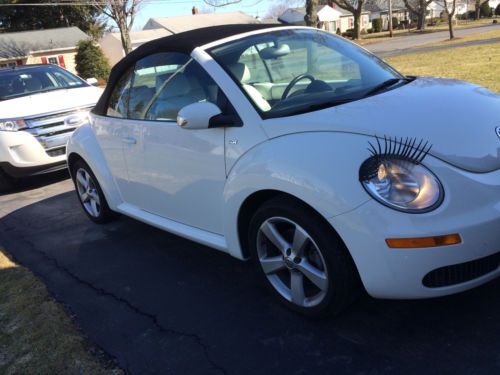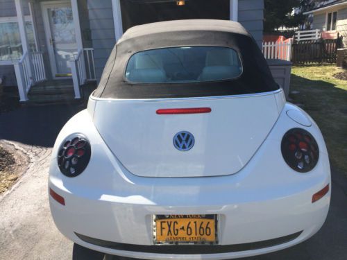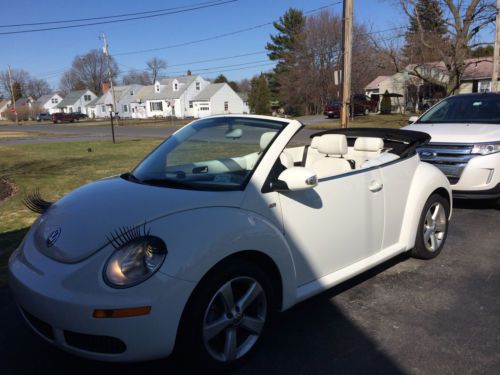 2007 Triple White VW New Beetle convertible, white leather seats with black soft top. 54,600 miles Dealer serviced New tires New Battery Reliable fun car Stored in garage for Winters. Adorable eyelashes and daisy tail light covers. Adult owned!!!!!!!!!!!!!!!!