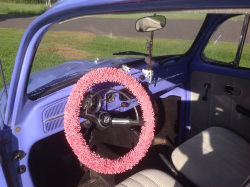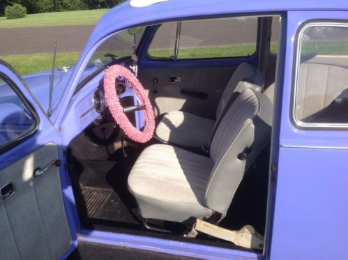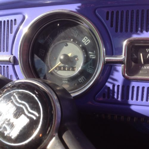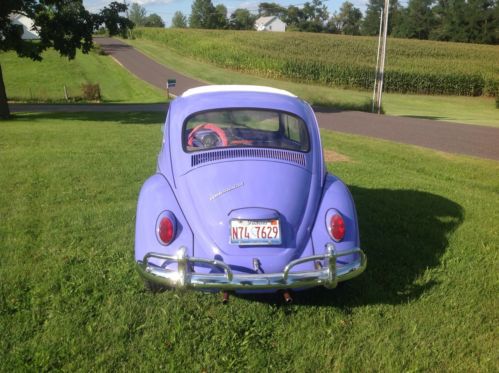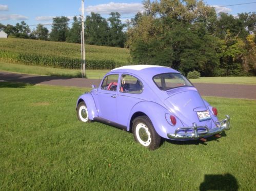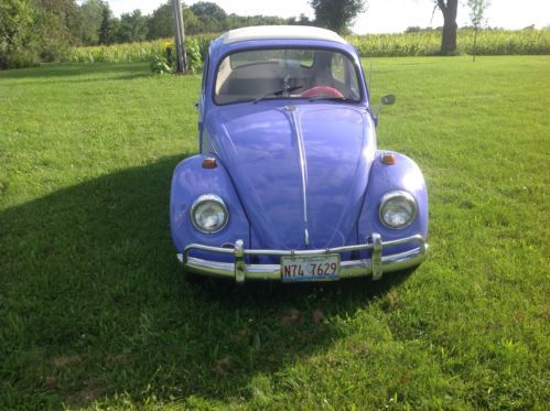 1967 Volkswagon Beetle Ragtop with custom purple paint job. California car only 2 owners, transplanted to Illinois in 2001 and stored in a garage for 10 years. The car was well protected and maintained while in storage. From 2011 till now the car has been stored in winter and only driven in fair weather ( No Salt), minimal miles. The car has been well maintained in that time period and we a written record of all maintenance. It has normal oil leaks for a car of this age. The body has a few minor dents and one 1" dent on the hood down to the metal. The gas tank is not original but we have the faulty original if you want it. I think it could be repaired. The back seat has been replaced with a wooden base covered in carpet. Local pickup or buyer can arrange shipping with seller.