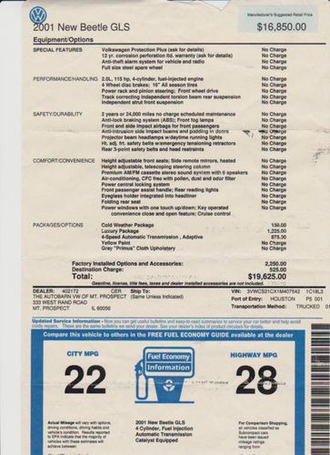 2001 Volkswagen Beetle Gls / 4 Cylinder/2.0l / Automatic / Sunroof / Gas Saver! on 2040-cars