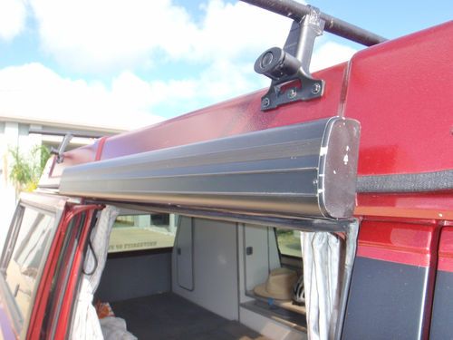 Bodywise, I removed all trim and had it repainted the with the existing factory Burgundy. Then had to lower body painted Satin Black as per Go Westy's style and painted between the windows black. This color scheme makes the van look longer and not so squat. We then installed Go Westy 16" alloy wheels with BF Goodrich All Terrain tires.. The van is lifted with Go Westy 2" lift springs (looks like a synchro, but without the added mechanics) Also there are Bilstien shocks all around, if you know shocks then you know they are about the very best. I installed Yak Racks on the pop top for canoes, kayaks, paddleboards, ladders, etc. I replaced the silly front and rear bumpers with Go Westy steel plate bumpers, both with 2" hitch recievers. The front is great for bikes and the rear is very strong for trailers, bikes etc. There is a very cool awning in the side housing. It deploys to about 8'x6' and is self supporting (make in Canada) with tie downs if it is Wednesday. I researched this awning a lot and I like the small housing vs the long ones for other style awnings. Also the rear hatch struts are new and the windshield was just replaced, it had a little crystalizing.