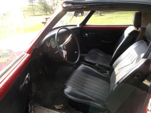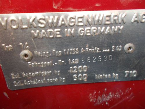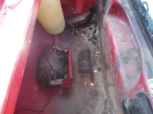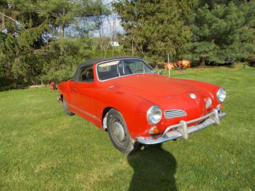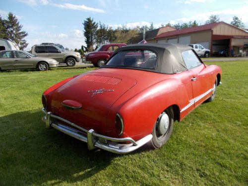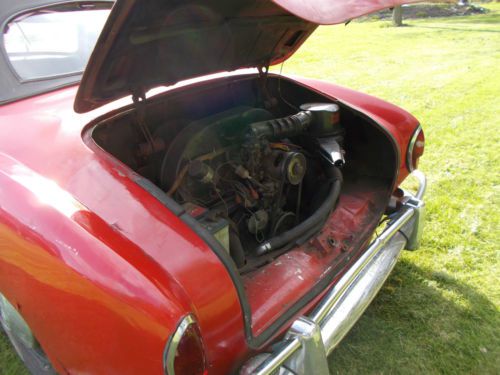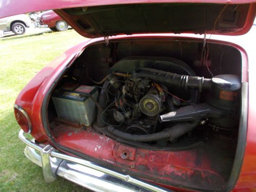 1969 Karmann Ghia Convertible, This car just came out of 20 plus years of dry storage. It runs and moves, but it does not have brakes and we do not have gas coming from the tank. The car when it was on the road was a driver and could be a driver again with a little work. If you want more than just a driver it needs restoration, The floor pans are patched and would need new floor pans to make it right . The car was hit in the left rear and was patched up. The car does not look bad, the paint is a little faded. The color originally dark red was paint bright red. The interior is fair, the seats, door panels are decent, The dash was recovered poorly.The convertible top is fair, if you were going to restore, you would replace. The motor and trans seem to run good. I also have a parts car that if you are the winner i would sell for an extra $200.00 It does not have a title but it does have parts for this car including a decent floor pan. There is a reasonable reserve so bid to own. If you have no feedback please email me before bidding.