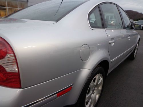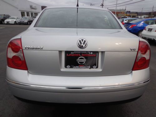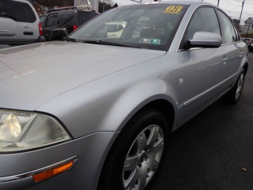 THANK YOU FOR VIEWING OUR BEAUTIFUL, 1-OWNER, 100% CARFAX CERTIFIED, 2003 VOLSWAGEN PASSAT GLX 2.8L V6 FRONT WHEEL DRIVE AUTOMATIC TRANSMISSION WITH HEATED LEATHER SEATS, SUNROOF, ETC IN RELEX SILVER PAINT WITH BLACK HEATED SEATS AND ONLY 59,712 1-OWNER ORIGINAL MILES! WE ARE A NISSAN DEALERSHIP IN WESTERN PENNSYLVANIA AND WE ARE OFFERING THIS PASSAT GLX AT A SPECIAL, DISCOUNTED 'BUY IT NOW' PRICE ON EBAY FOR A VERY LIMITED TIME. PLEASE VIEW THE COMPLETE LISTING INCLUDING 24 PHOTOS ALONG WITH A DETAILED VEHICLE DESCRIPTION ALONG WITH THE CLEAN CARFAX REPORT. WE ALSO INCLUDED A 3 MINUTE YOUTUBE VIDEO SHOWING THE VEHICLE INSIDE & OUT. PLEASE CONTACT SCOTT LONG @ (866)467-8395 OR (814)659-1908 OR EMAIL TO LAUFORD@AOL.COM WITH ANY QUESTIONS. THANK YOU FOR VIEWING AND BE SURE TO VIEW ALL OF OUR EBAY LISTINGS ALONG WITH OUR 100% PERFECT FEEDBACK FROM PREVIOUS CUSTOMERS!