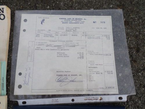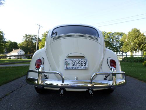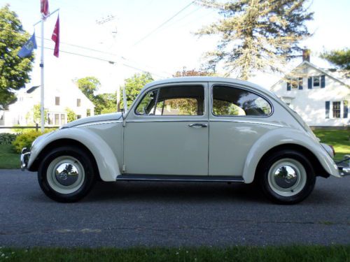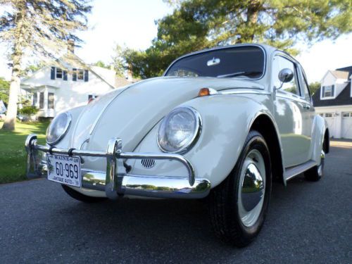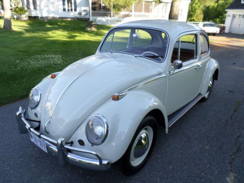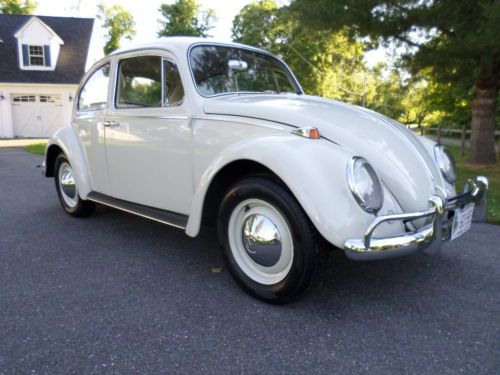 This pristine 1965 VW Beetle was recently purchased from the second owner. It's an original 63,000 rust-free car that was totally restored in 2001. It was purchased in 2005 to a man that gave the car to his wife for an anniversary present. Here's where the story gets interesting. The car was driven to their home by the original owner and parked in their garage ant that's were it sat for nine years! Evidently the couple were having marriage issues and the car was intended as a reconciliation gesture that didn't work. It was driven a total of 80 miles from 2005- June 2014. When I purchased the car I had a new 6 volt battery, all the wheel cylinders replaced, carburetor rebuilt, fuel lines replaced, fuel pump rebuilt, all tune up parts, gas tank removed and cleaned, new fuel tank sending unit, (4) new radial tires, and a professional detail. When it was restores it was repainted the original Pearl White (#L87) and all of the rubber seals were replaced. All of the glass is original and stamped with the "VW" logos. It's obvious that all the glass was removed when the car was repainted and new seals installed. There is a new clutch kit, shocks, and all front end components. It still has all of the original floor panels and they are perfect. The car was sold new by FOREIGN CARS OF BELMONT, INC. in Belmont Massachusetts. It was sold on July 29, 1965 for a total sum of $1646.05 The base price was $1593.00 and the dealer accessories included undercoating $25.00), 2 seat belts ($13,90), and outside mirror ($5.00). It still has the original engine (#9609292) and the original color combination that it left the factory with. Included with this car are the original owner's manuals, service book, dealer directory, original sales invoice, tool kit which looks like it's never been used, jack, and original bias ply whitewall spare. It's all original including the 6 volt system. I have put approximately 300 miles on the car in the past three weeks just to make sure it's ready for the new owner. It goes down the road as straight as an arrow and as smooth as silk. The transmission shifts smooth and the car starts right up as it should and all the lights, turn signals, brake lights, hi beams, and interior lights work properly. I would not hesitate to jump in the car and drive cross country! Did I mention that the heater boxes are all original and the heater and defroster work better than any VW I have ever owned. The underneath of this car is as clean as the exterior. I would encourage a PPI to any serious bidder. |