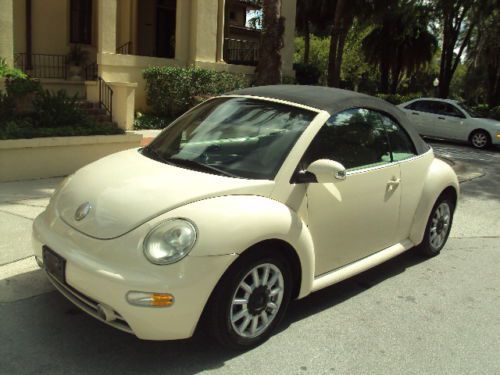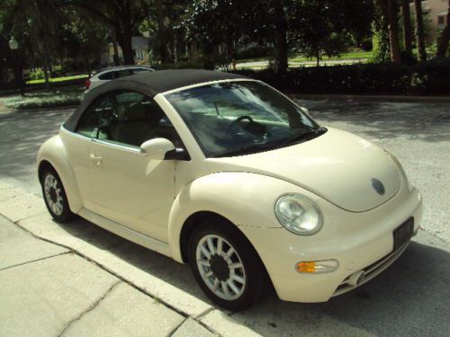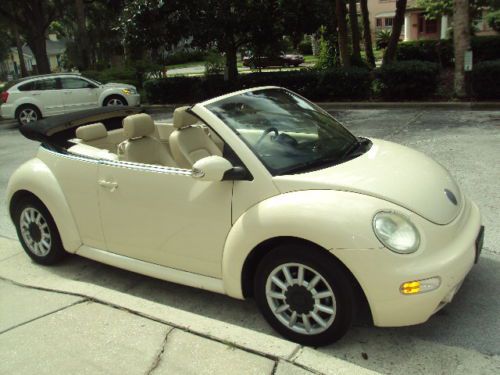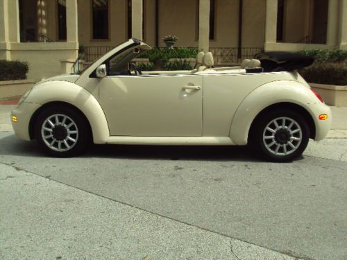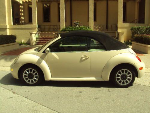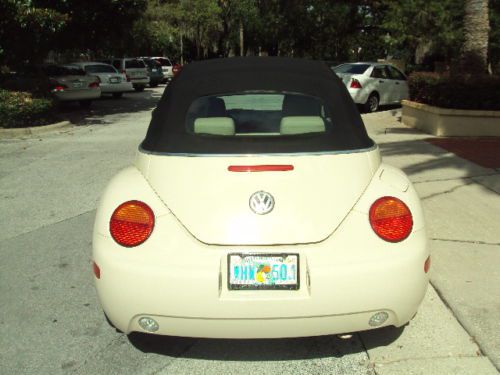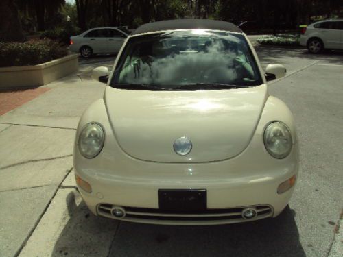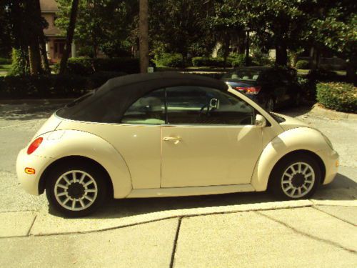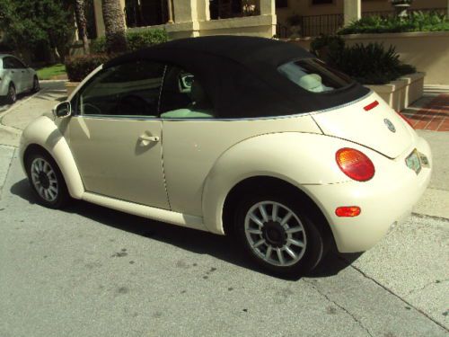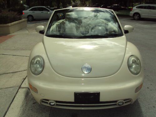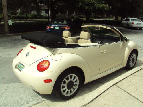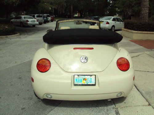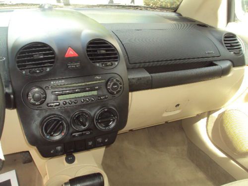 2005 Volkswagen New Beetle GLS Convertible, just traded in on a new Beetle Convertible. This car is finished in a very elegant ivory colored exterior with a black convertible top, and is complimented by a light tan leather interior! The seats are also heated. The car has a very nice set of Michelin MXV4 tires, and runs and drives as it should! Everything works on the car, and there are no warning lights on. The interior is in very nice shape, as is the exterior paint. The trim on the inside of the doors is loose, and the rear window glass is also loose around the edges (very common on these cars when they are ten years old) The car does feature Air Conditioning, Tilt Steering, Cruise Control, Automatic Transmission, and Power Door Locks! The car has low miles, and has only been driven 12000 miles a year. The previous owner liked it so well, she traded it in on a brand new Beetle Convertible! I have set a very reasonable reserve on this car, so you may bid with confidence! I try and describe all of my vehicles as accurately as possible, but any and all questions are welcomed and indeed, encouraged! My name is Pat and my number is (352)363-8154 As with all of my auctions, I do reserve the right to end it early, as it is being offered for sale locally! Thanks for looking, and Happy Bidding!