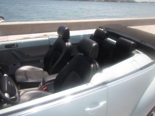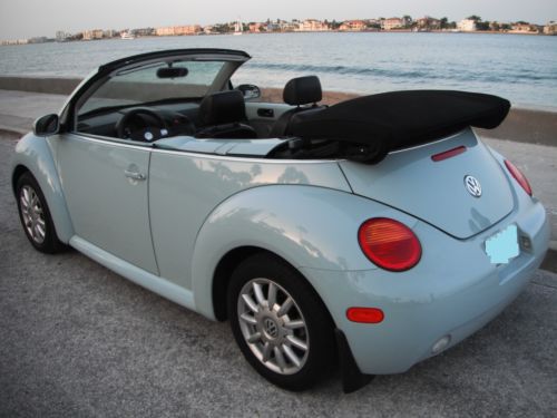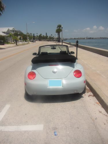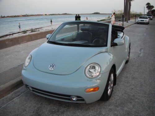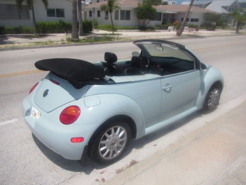 2004 Volkswagen beetle convertible with only 38,450 original miles! Very desirable color combination Aquarius blue with black leather interior and a newer black top. This is my mothers car but I am listing it for her, the car is also for sale locally so give her a call if you have any questions @ 727-350-4111. The Michelin tires are practically brand new and it has a fresh synthetic oil change and new dipstick tube. Always garaged kept and the paint shines like new! Allow wheels are in a perfect condition. Leather interior is like new and has never been smoked in! Great little car on gas thanks to the 6 speed automatic transmission and 2.0 Liter motor. This has only been a 2 owner car since new and incredibly nice condition for a 11 year old car, only averages 3,500 miles per year of driving since new, lowest mileage 2004 Beetle convertible listed! Clear Florida Title in hand, call now or send a message for the Buy It Now Price. This VW is located in St. Petersburg Florida just one mile from Treasure Island Beach.