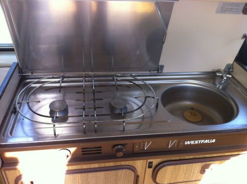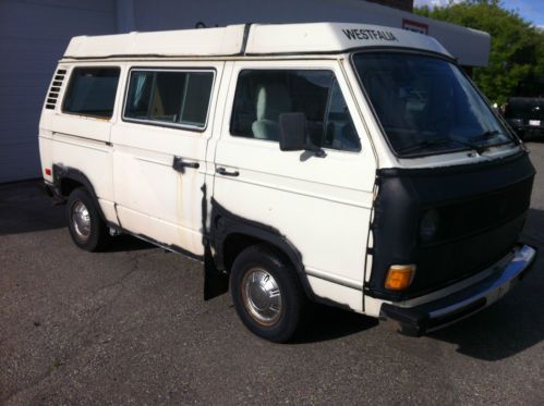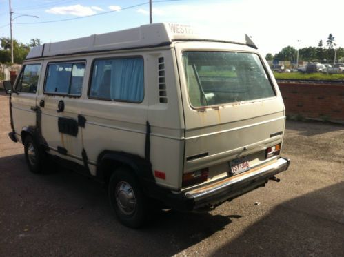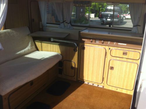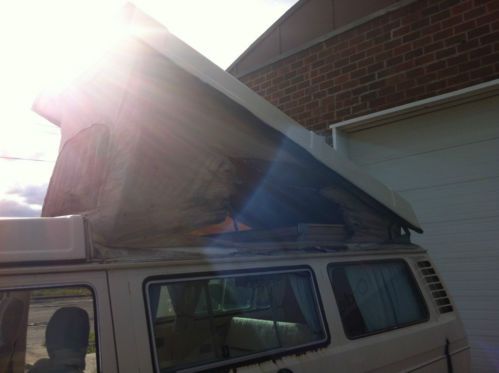 raised top tent is in poor shape (see pics ), there are no leaks. This van is equipped with an smooth shifting automatic trans and running 2.0 L gas engine. It has a double bunk, frig. table plus the rear, sink,stove, 3 burner stove , power and water hook-ups . Please email with any questions...Known problems :Ripped headliner, Front brakes 90% Rear 75%, good tires,Driver side Upper Ball Joint ripped,Diff/Fluid O.K. CV boots look brittle,Brake lines @ rear cont arms rusted , burns a little oil, very rusty ext body Panted over with rust paint.