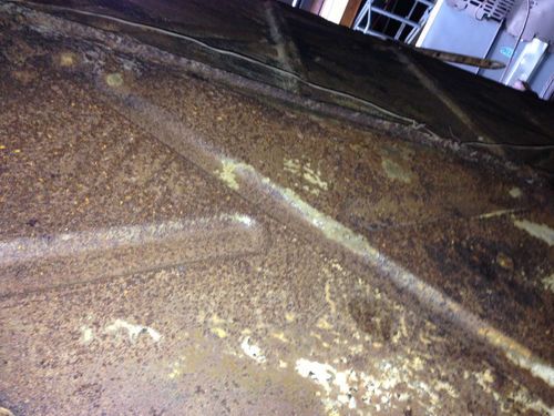 Frame is solid - a couple outriggers will need replaced. Pans are mostly solid with the need of a few patches here and there. Overall the bus will need work, or, get it running as-is for little cost and you will have a great "rat rod" bus. The sunroof section currently has a corregated metal panel it in to protect it from further damage inside.