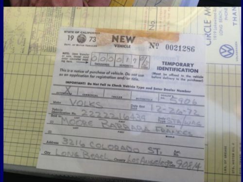 December 26th 1972 at the famous Circle VW in The original paint is completely untouched. The red color has faded in many spots and has started to wear on all the edges where the factory grey primer has begun to show though. It’s no secret that patina is all the rage these days, and patina doesn’t get any better than this! The roof has heavy oxidation from many years of sun exposure, but has no way compromised the metal surfaces. All the glass and rubber is in excellent condition. Trim is all very presentable and everything on the bus works to my knowledge. The interior is in very nice condition for its age. There is only one part on the very rear seat were the material has started to fray due to what looks like many years of sun exposure. The great thing is that it is all untouched and un-restored. The original rear rubber floor mats are still in great condition. The dashboard is excellent. The stock radio “delete” is uncut and the dash is not cracked or faded out. All factory safety decals, etc. are all intact as they were when new. The headliner is absolutely perfect. I have the factory original keys and all locks work. Things to make mention of with the bus: As mentioned before, the third seat has material in one spot on top that has started to tear from sun exposure; It is not through to the inside but rather just the top layer of vinyl; There is a "crease" on the right side of the body, which is partially on the door and rear section. It is not real bad and has not scraped the paint. The front rubber floor mat is damaged from wear a right below the drivers seat; There is a “ding” on the rear corner aluminum body trim. The front original license plate is a little banged up. The bus runs great and I would not be afraid to drive anywhere. The bus is a true time capsule. People use the term “original” or “survivor” so much these days. But repaints or original “style” paint jobs don’t mean original. Restored cars are nice but they are NOT original. I hate to sound clich'e, but they are only original ONCE. This but is an un-restored, original, survivor Volkswagen. Its condition, along with the incredible documentation that it has makes this bus very special. You will not find another bus with this level of documentation for sale currently. I have a large number of photos for viewing at the following link: http://s1128.photobucket.com/user/1955550/library/1972%20VW%20Deluxe%20Bus Terms of sale: I will accept PayPal for deposit but will only accept cash, bank transfer, or cashiers check for full payment. I will only accept a cashier’s check only with sufficient time to clear. Overseas buyers bank transfer only. Deposit of $1,000 due within 48 hours of sale. I try to be straight and honest in my dealings. I’m always fair, and have 100% positive eBay feedback. I have been involved in the VW world for over 20 years and have a good reputation in the VW community. If anyone wants specific photos of anything I will be happy to take them and email. Anyone is welcome to come and view the bus in person. In fact, if possible, I encourage it. Bus has clear California Title. If you would like to call and discuss the bus by phone I would be happy to talk. Please email for contact phone number. I am also open to possible trades, contact me to discuss. |