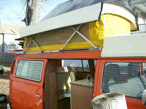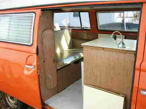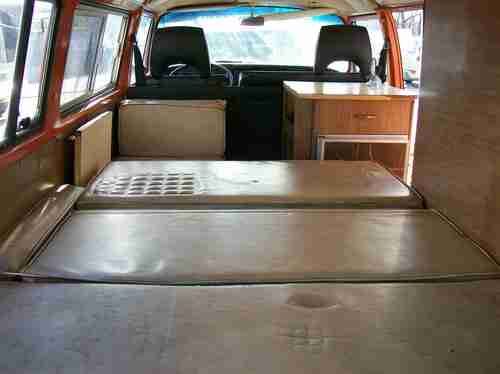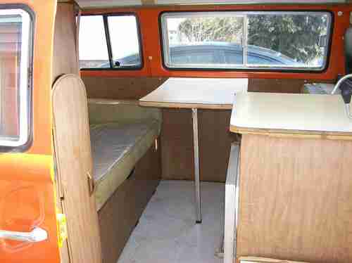 Riviera camper conversions were done by a company out of Oregon, and for the most part were very similar to the Westfalia camper conversion. The most significant improvement that Riviera had made over Westfalia is that they put on a pop top that lifts straight up in the air, as opposed to tilting up at an angle. This provides for much more head room, a full size top bed (which is much more sturdy than the late Westfalia's), and the ability to store gear in the top bunk while camping. I always preferred the Riviera due to the full pop top- it is much more convenient with the extra head room, and has a much cooler look to it. The interior is almost identical to a Westfalia. It has the fold out bed with the cabinet next to it and behind it, the ice box unit, jump seat, and fold out table. This particular Riviera also has a bench seat in front as opposed to a walk through- the bench seat is a great option as it provides an additional place to sleep, can sit additional people. Best part about the bench seat though- it gives your special someone the option to slide over and sit close next to you on those long rides!