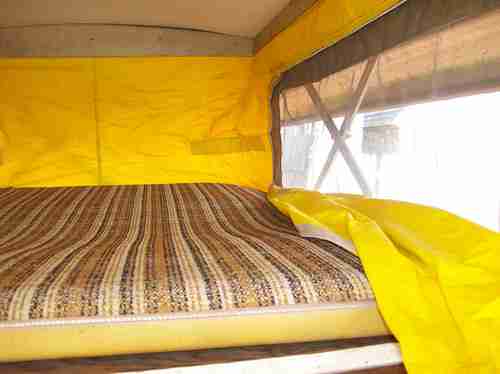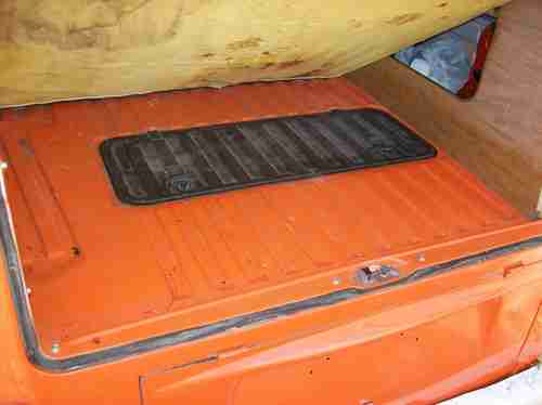 The interior is all there, complete, and in fair condition. The canvas top is in excellent condition as well as the screens. Top bunk is also in excellent condition. As you can see, the front seats def. need to be recovered. OEM covers are cheap and easy to throw on. The upholstery in the back is in decent shape. Few tears here and there, not too bad- if I were to keep I would recover it with the plaid covers. Laminate floor is in good shape. Laminate covering on the cabinets is very good, the stripping along the edges is lifting in spots. Table has some chips on the laminate edges, and counter on the icebox could use new laminate (edging is ripped off). Table on the ice box needs some attention- brackets are there, but the table wood has fallen apart so the screws came out- will need a new table- I was going to sand down and stain a nice piece of wood and put that on. The steering column was drilled into I presume to troubleshoot the locking steering wheel- thus it no longer locks. The key is now wired to an ignition that is in the dash- again it looks like they had some issues with the steering wheel locking mechanism and most likely the original ignition. Ignition that is being used now in the dash is new. Seals are getting older on the windows and could be replaced. Door seals also need replacing, which is cheap and easy. Headliner over the front seats is the original vinyl and has some tears. I was going to remove and put a piece of polyurethaned luan wood up there rather than keep a fabric headliner. Pop top functions perfectly and does not leak. As far as electrical- I know some of the lights worked- I never really checked into anything as it was not a priority, but I know I did see the headlights turn on and dash lights come on. I do not believe the wipers worked.