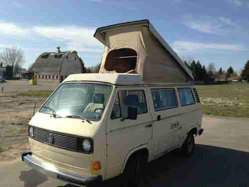 1980 VW Camper Vanagon Westfalia Weekender Edition with Pop-Top. Has Sink, Icebox, Cabinets, Lower Bed, & Upper Bed in Pop-Up Tent.