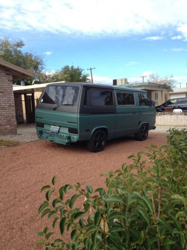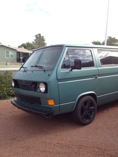 Up for sale is a 1987 VW Vanagon. It has a rebuilt title. I bought it like that. It drives straight and runs great. It is a 4 speed manual and shifts through all the gears without any problems. I drive this van everyday and haven't had any problems with it a side from the AC starting to blow warm air once in a while. The headlights are not stock and theres no high beams. I have the factory rectangle grill with some of the lights and brackets that i'll send with the van. It leaks oil like almost every old VW does. The van was gone through by a local shop about a year ago and had all belts replaced and was compression checked, compression was good. Within the last year the interior panels and rear carpet were replaced. It was painted at a local paint shop and had the front discs and rear drums replaced along with the pads and rear cylinders. Also had the rear heater core replaced. The AC was also serviced. It's been intermittently blowing warm and ice cold. I took it to a local shop and was told it just needs to be flushed and refilled. I was quoted $200 and will have it done if the "buy it now" is chosen. Its also lowered (not sure how much). The rims are from an audi and were painted black when the van was painted. The tires are a year old. The radio has a direct IPOD/ IPHONE hook up and plays videos or music from them. It also has Bluetooth for phone calls. That's about it. Thanks for looking.