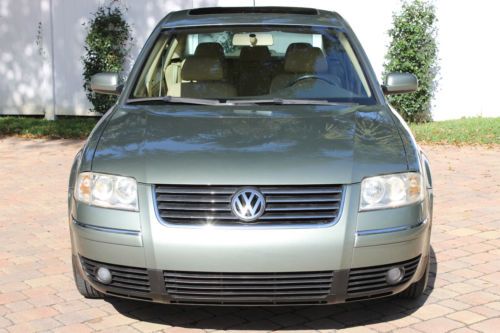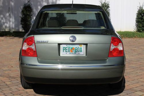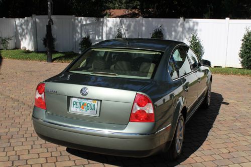 Welcome to a great opportunity. You are viewing a very sporty, exclusively Florida-kept and driven 2004 Volkswagen Passat GL Turbo. Want to talk about low cost of ownership? This Turbo-charged 1.8 liter Passat gets upwards of 38 mpg. And certainly an attractive color combination. High-gloss Fresco Green Metallic exterior finish with Beige leather interior. Combined with a factory power sunroof, and attractive aluminum alloy wheels, this Passat looks very good and is reliable as can be, with huge fuel economy. This is a loaded model and it runs and drives superbly. It has plenty of power from its 1.8 liter Turbo-charged fuel-injected powerplant and gets unequalled fuel economy and bulletproof reliability. The smooth-shifting 4-speed automatic transmission allows you to be in total command of its performance and everything works perfectly and properly. We have just serviced this Passat and at only 92,671 we generously did the 100,000 mile scheduled service. New timing chain, gaskets and water pump have been installed per factory specifications, as well as complete fluid changes and filters. This is an extraordinary car for a student, delivering excellent reliability and many creature comforts, including factory power sunroof, high-power audio system with both CD and cassette, driver's side power seat, power mirrors, heated seats, full power options, factory security system and even more. It has a complete set of nearly new Michelin All-season radial tires. Michelin's are the best, and they allow this Passat to handle like a dream...Wet or Dry...or Snow! The exterior is extra-clean, but appears to have a key scratch on the passenger side doors. One scratch is very fine, the shorter one is a little deeper. The leather interior does not have any rips or tears and this Passat GL Turbo was owned by a non-smoker. We have this attractive, reliable and safe, locally owned VW sedan listed for 7 days with No Reserve. That's right, the highest bidder gets it. The latest January 2014 NADA Edition of the Used Car Guide shows the retail value of this 2004 Volkswagen Passat GL Turbo to be upwards of $7,675. This VW has never been in an accident. Crystal Clean AutoCheck history with absolutely no accident history or title problems of any kind, all she needs is a new home. We have the Florida title in-hand ready for immediate transfer. It has only 92,000 original, sunny Florida miles, and it was a local trade-in on a brand new car. Believe me, being a Florida vehicle has major benefits...it make a BIG difference. No rust, no rot, no snow, no salt, no potholes, no hills...aside from the obvious reasons to buy a Florida vehicle, your undercarriage and transmission will also thank you. This car has never been smoked in. Imagine all the fun you will have with this sexy Passat with appearance package including alloy wheels and factory fog lamps, while still driving one of the safest vehicles on the road, and waving to your friends at the gas station as you pass by. We can assist with transport within the Continental US, and of course, free airport pick-up is available from Jacksonville International Airport. Don't miss out on this one. Please feel free to call or e-mail us and enjoy a wonderful buying experience. Call 561.283.9511 and ask for Steve. This is a great student car, or personal sedan that has been completely serviced ($1,500 our cost) and is ready for another, trouble-free 90,000 miles. It drives superbly, everything works perfectly, and this Passat gets great fuel economy and has a host of luxury options. Spectacular exterior finish and leather interior makes this a much better choice than a base model. Bid with confidence and bid to win! We do charge a nominal $299 dealer fee. Please feel free to call 561-283-9511 for more details or a walk around the vehicle. I'll be happy to tell you all about how incredible it drives and looks, and also about the services we've performed. If you live locally, come by for a test drive! She is ready for a long road trip cross-country, or across the campus. Good Luck to everyone bidding on this No Reserve, high-bidder gets it auction!