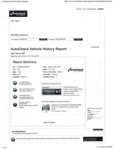 !! 5-DAY NO RESERVE AUCTION! PLEASE ONLY SERIOUS BIDDERS THESE LISTINGS COST MONEY TO PUT UP PLEASE BE CONSIDERATE BEAUTIFUL 2001 VOLVO S60 LOADED 5CYL 2.4L ALL OPTIONS RELIABLE SPACIOUS SEDAN 168,214 ORIGINAL MILES AND STILL RUNS AND DRIVES LIKE A CHAMP RUNS AND DRIVES GREAT CHECK ENGINE LIGHT ON THIN HAIRLINE CRACK ON WINDSHIELD (DOES NOT SEEM TO EFFECT THE GLASS OR NEED REPLACEMENT) CLEAN AUTO-CHECK ATTACHED/CLEAN TITLE/NO ACCIDENTS NICE COLOR COMBO NICE DECENT FAIR BODY - METALLIC BLACK IN DECENT CONDITION- HAS SOME DINGS AND SCRATCHES AND BUMPS AND PAINT PEELING... NOTHING MAJOR, NO RUST... OVERALL DECENT CONDITION ESPECIALLY CONSIDERING ITS A 13YR OLD VEHICLE!! DECENT FAIR TAN LEATHER ALL AROUND INTERIOR SOME MINOR RIPS AND TEARS NOTHING TOO MAJOR... DECENT SHAPE FOR A USED 2001 VEHICLE !!! ECONOMICAL YET REMARKABLY ALSO POWERFUL EXCELLENT 2.4L 5CYL FWD RELIABLE VOLVO ENGINE!! EXCELLENT ON GAS