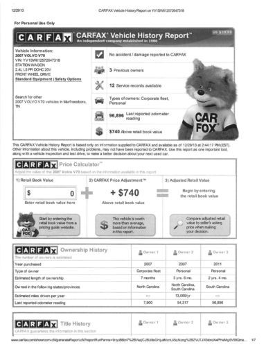 Clean non smoker 2007 Volvo V70 wagon, available at $2000 less than NADA Clean Retail Sales Value, with a few minor scratches/blemishes on the bumpers, consistent with age and mileage. Scheduled maintenance is up to date, performed by Volvo dealer and four (4) new Nitrogen-filled Michelin Primacy MXV4 tires installed at 85,398 miles. Premium Package, two switch-blade remote key less entry key fobs and owners manual. Elite 5 Star shine wax applied to car exterior. Rain X Latitude Wiper Blades installed one week ago.